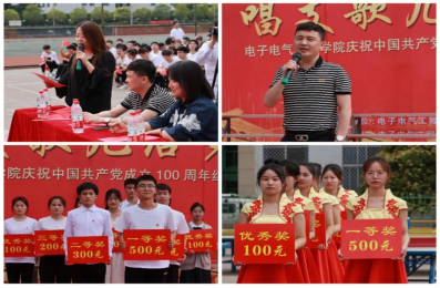 《七子之歌》《我的中国心》《不忘初心》深情丰沛、浓烈深沉,《光荣与梦想》《强军战歌》《祖国颂》气势恢宏、铿锵有力,《我和我的祖国》《爱我中华》《毕业歌》歌声华丽、 韵味醇厚,《追寻》《祖国不会忘记》《我们都是追梦人》感情真挚,旋律优美,为比赛增添了专业性和艺术性。在比赛最后,参加活动的全体师生与现场观众在歌声的感染下, 情不自禁地挥舞着手中的党旗与国旗,高唱《没有共产党就没有新中国》,表达出了电气人感党恩、听党话、跟党走的坚定信念,对党成立100周年华诞的深情祝福。
