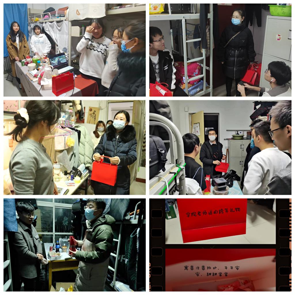 礼包内装有防护口罩和糖果,寓意着做好自我防护尽快战胜病毒,在新的一年里生活甜甜蜜蜜。在走访过程中,老师们就同学们的生活与学习近况进行深入了解,提醒各位同学要在过节期间做好安全防范,坚决做到“不信谣”“不传谣”“不造谣”,也给家人电话报个平安,在公司欢欢喜喜过一个平安年、健康年,希望同学们在新的一年努力上进、奋勇争先,在期末复习备考期间能做到劳逸结合,学习、健康两不误,以更加乐观积极的心态应对突如其来的疫情大考。