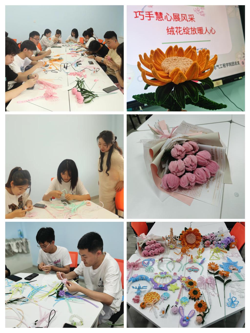 扭扭棒是做手工常见的新型丝网花骨架材料。它柔软万变、质轻韧性好,可重复使用,适合创造性立体编制,也可与毛球搭配使用,制作立体玩偶造型等。活动现场,员工会负责人员提前将准备好的材料摆放在每一张桌上,一根根五颜六色毛茸茸的“扭扭棒”、几支胶水、几卷花艺胶带等在同学们一扭一折之间变成了一朵朵栩栩如生的郁丁香、百合花、向日葵、小雏菊、发箍、小动物以及卡通人物等。活动过程中同学们积极交流、现场气氛热烈。