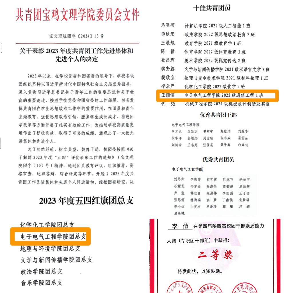 近日,校团委印发了《关于表彰2023年度共青团工作先进集体和先进个人的决定》文件。公司团总支获2023年度“五四红旗团总支”荣誉称号;2022级通信工程专业1班王俪儒同学获“十佳共青团员”荣誉称号;2021级电气工程及其自动化专业1班等12个团支部获“五四红旗团支部”荣誉称号;2021级轨道信号交通与控制专业1班段华洋等15名同学获“优秀共青团干部”荣誉称号;2022级电子信息工程专业1班屈佳辉等26名同学荣获“优秀共青团员”荣誉称号。同时,公司团总支书记李倩荣获第四届陕西高校团干部素质能力大赛(专职团干部组)二等奖荣誉。
