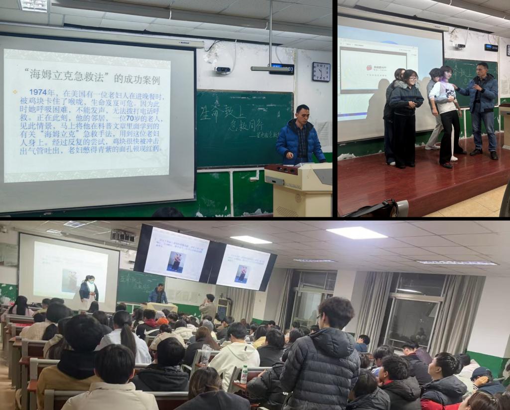讲座围绕心肺复苏急救技能与气道异物梗阻急救法展开系统讲解与实操演示。王夕顺医生结合真实案例,详细介绍了心脏骤停的识别要点、胸外按压的标准手法、人工呼吸的操作规范。他还针对气道异物梗阻的紧急情况,现场演示了海姆立克急救法的操作步骤,并邀请师生上台模拟演练,帮助大家更直观地掌握动作要领。现场气氛活跃,同学们纷纷表示,通过这次学习,不仅掌握了实用的急救技能,更增强了面对突发情况时的信心与责任感。