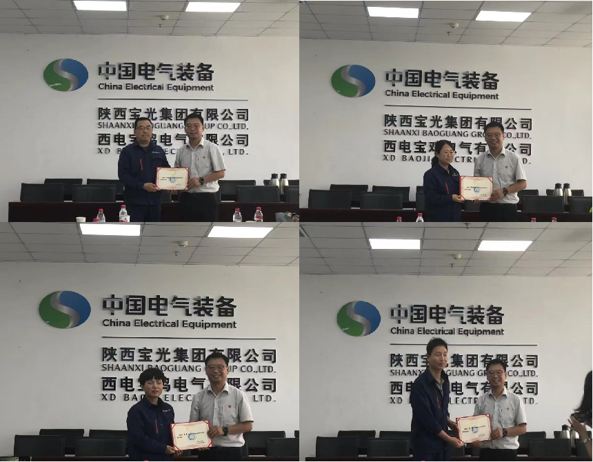 聘任仪式上,公司党委书记党建波分别为西电宝鸡电气有限公司周长江、党丽敏、杨超、李萍等4位高级工程师颁发了校外专业硕士研究生导师聘书。
